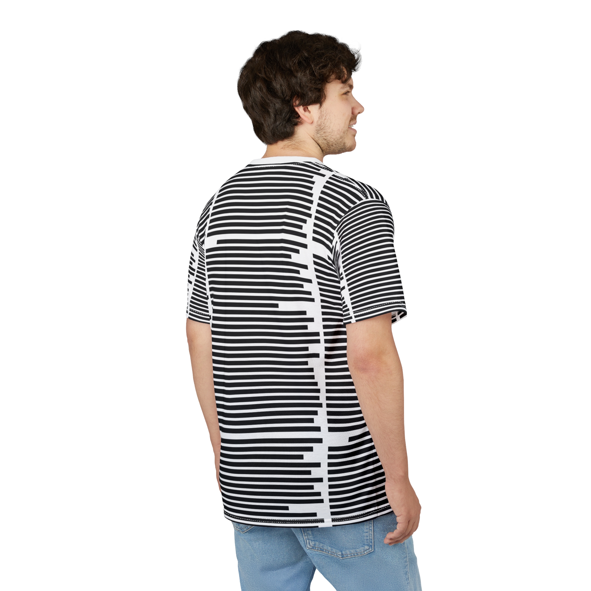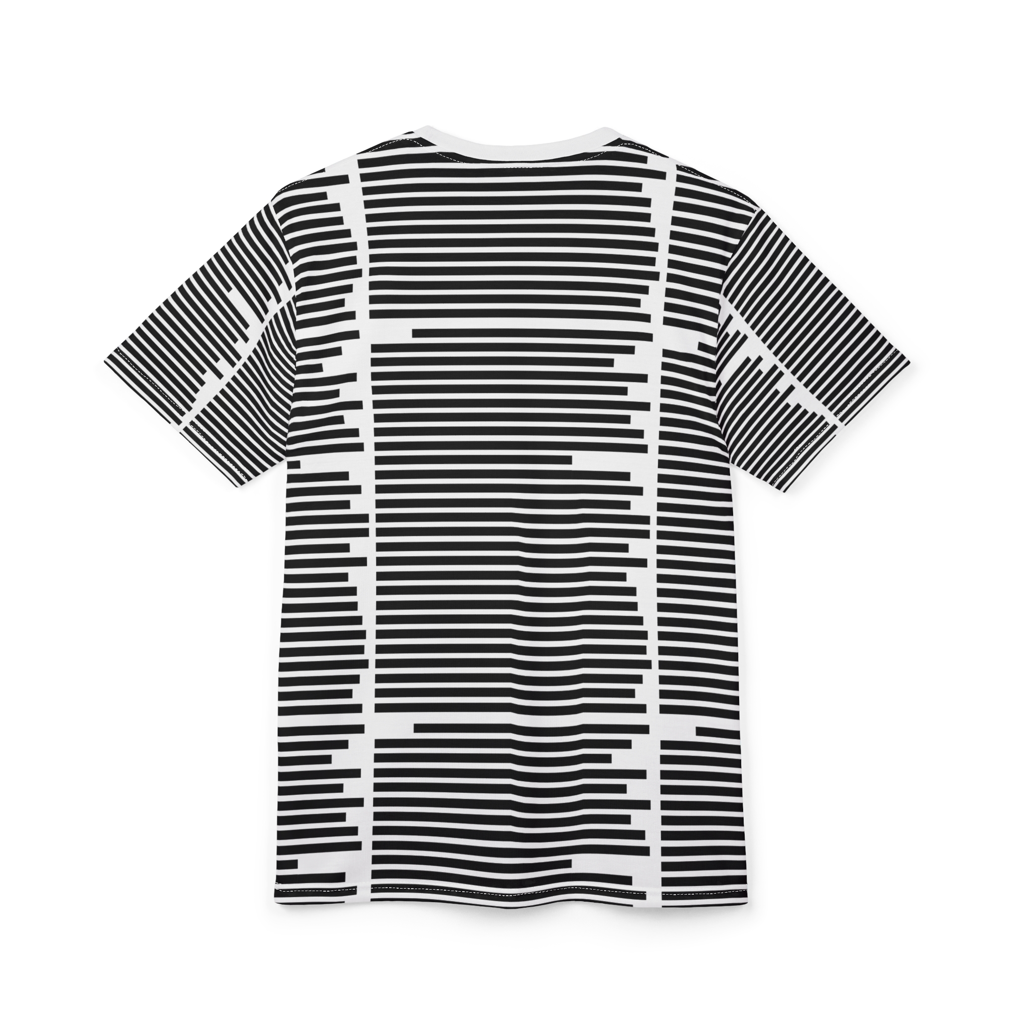 This all-over print tee brings graphic modernism to everyday wear. Lightweight polyester keeps the shirt sleek and dry while the bold horizontal bar pattern creates a striking, slightly off-kilter optical effect that reads like a hand-drawn barcode or city skyline at a distance. Short, structured sleeves and a ribbed collar give it a clean silhouette that layers easily under a jacket or stands alone on warmer days. Wear it to gallery nights, late-night record hunts, or weekend coffee runs when you want something that feels deliberately curated and quietly confident.